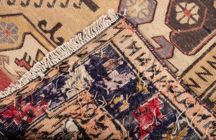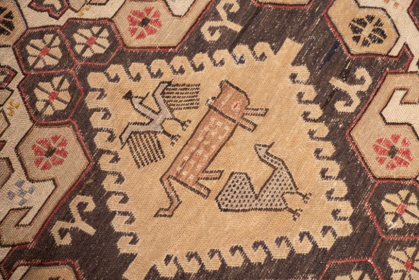 A Sumak Kelim, the beige field with triple hooked lozenge medallions, all over hooked designs and stylised birds, enclosed by a main indigo serrated diagonal leaf border, 205cm x 120cm.