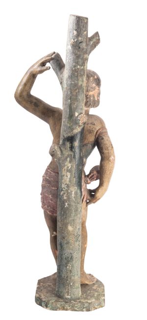A Continental provincial painted stone model of Saint Sebastien, probably 18th century; portrayed standing before a tree, nude but for a loincloth; with piercings to his torso for arrows (missing); on an integral octagonal base; 75cm high; (old losses)Provenance: From the Estate of the late Matthew Upham