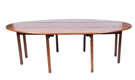 A mahogany dropleaf wake table in 18th century style, 19th century; the oval top with moulded edges; on straight legs with moulded outer angles; 77cm high, 243cm long, 126cm wideProvenance: The Estate of the Late Geoffrey Rowe (1948-2021), known by his stage name, Jethro