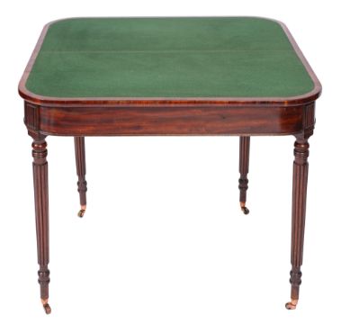 A Regency mahogany card table in the manner of Gillow, the rectangular baize lined hinged top with rounded corners on ring turned and reeded tapered legs, terminating in brass cappings and castors, 87cm wide, 44cm deep and 72.5cm high..