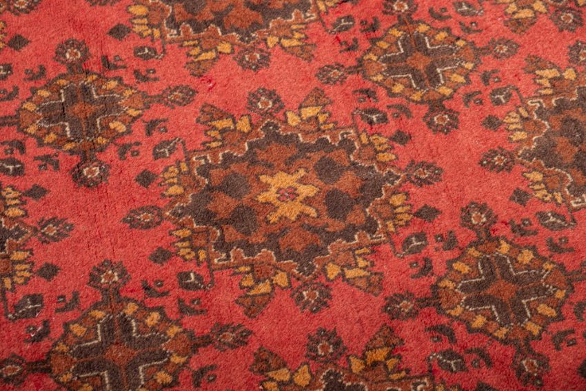 A Turkoman rug, the rose field with an all over geometric design enclosed by a shaded geometric border, 216cm x 229cm.
