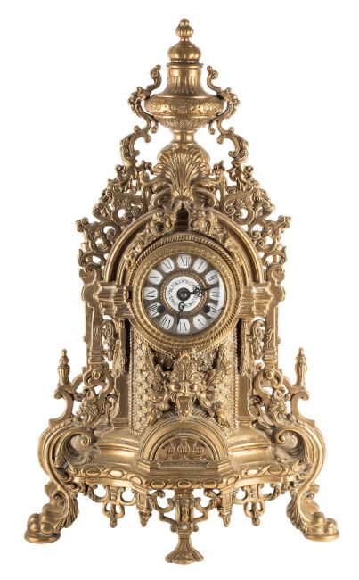 A modern gilt-metal cast mantle clock in the Louis XIX style the eight-day duration movement having a floating balance and striking on a bell, the dial with Roman numerals, with a cast-brass case with applied mouldings of classical form, height 60cm.Provenance: From the Estate of the late Matthew Upham
