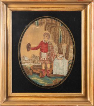 A Regency silkwork embroidery depicting Robbert Burns at his Father's grave, early 19th century; the poet portrayed in Highland attire; the oval embroidery within a verre églomisé rectangular surround and a giltwood moulding frame; 47 x 41cm overall