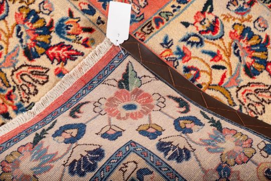 A Sarouk carpet, the compartmented field in ivory, rose, indigo and green colours with floral designs, enclosed by a main ivory floral, foliate and palmette meander border, 305cm x 238cm.