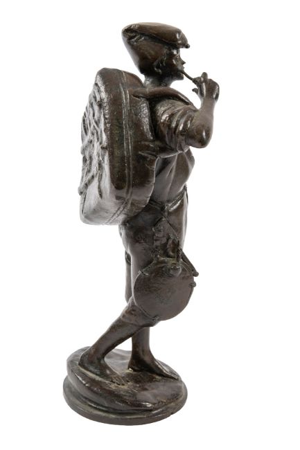 A Continental patinated bronze model of a young itinerant male, late 19th /early 20th century; portrayed in Phrygian cap and with a basket on his back; 17cm high
