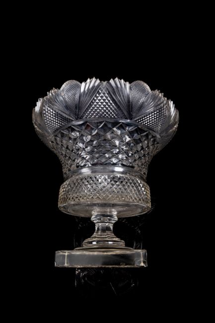 A clear glass pedestal vase of flaring form with notched rim cut with fret and hobnail bands, on a short stem and square foot, 24cm high.