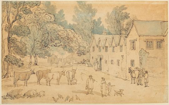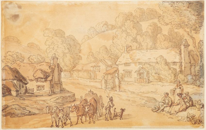 Thomas Rowlandson (British, 1756-1827) - 'Village street scene' and 'Rural scene' - Two watercolours on paper - 14.5 x 23.5cm, 36.5 x 44cm framed, and 14 x 23cm, 36.5 x 44cm framed - Unsigned, each bearing Appleby Bros. label verso, together with receipt from Appleby Bros, 1981. (2)