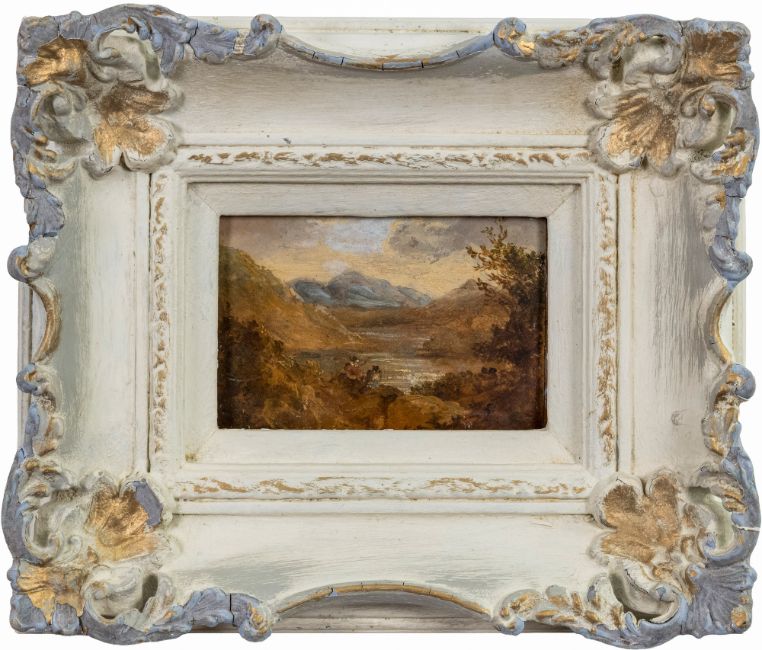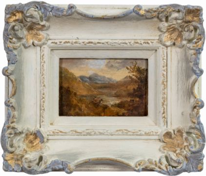 19th Century school - Figures overlooking a lake and figure on horse in a landscape - Gouache on paper laid on panel - Each 7.5 x 11.5cm, 21 x 24cm framed. Unsigned. (2)