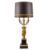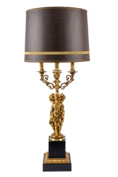 A pair of gilt metal and stone composition figural table lamps in Neoclassical taste, modern; each with a raised electrical fitment on a foliate cast baluster stem, above four scrolling branches with sockets and faux candles; each above three standing and adorsed classically draped maidens, on ebonised block bases with square socles; 94cm high including fabric shades