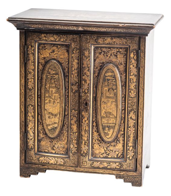 A Chinese Export black and gold lacquer table cabinet, Qing dynasty, mid 19th century the panelled doors enclosing five drawers, the whole decorated with panels of figures, buildings and landscapes on a ground of auspicious objects, flowers and foliage, 39cm high, 35cm wide [minor losses and wear].