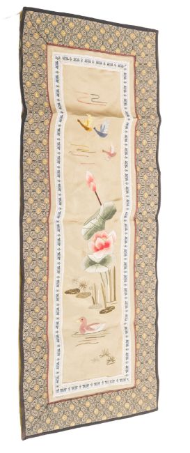 A Chinese silk rectangular panel, 20th century embroidered with water birds and lotus, 58 x 24cm unframed.