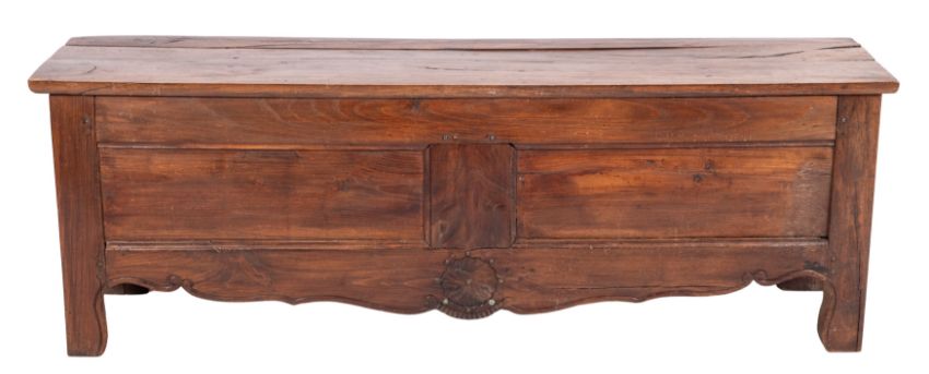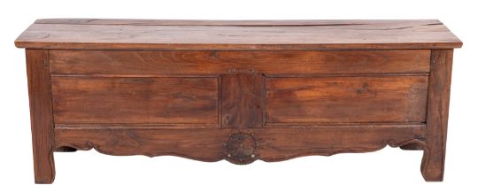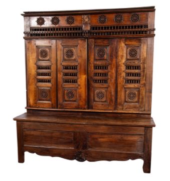An early 19th Century Breton fruitwood and pine side cupboard, with spindle roundels and spindle galleried ornament, having a projecting moulded cornice, enclosed by four sliding doors, the projecting base with twin panels, having a shaped apron with central rosette, on bracket feet, 171cm wide, 193cm high, 93cm deep.