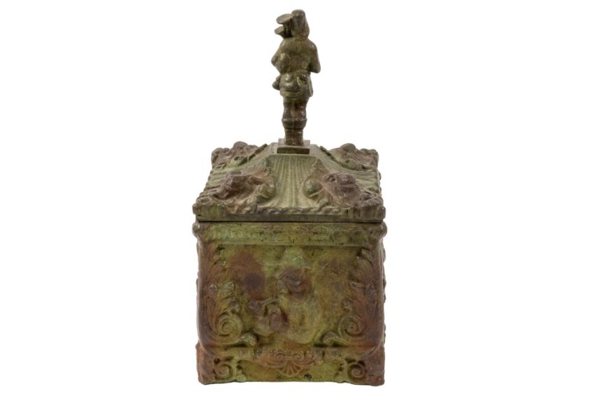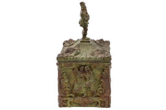 A walnut moneybox in the form of a miniature George III chest of drawers, 19th century; with moulded top edges, turned bone handles and bracket feet, 19cm high; a mahogany cutlery porter, early 19th century; 11cm high, 32cm long; a Regency double-sided hand mirror, 22.5cm, (cracked); a bronze alloy box, late 19th century; with finial cast as a piper, 25cm and an Indian bone, horn and brass mounted prayer cylinder, 23cm