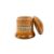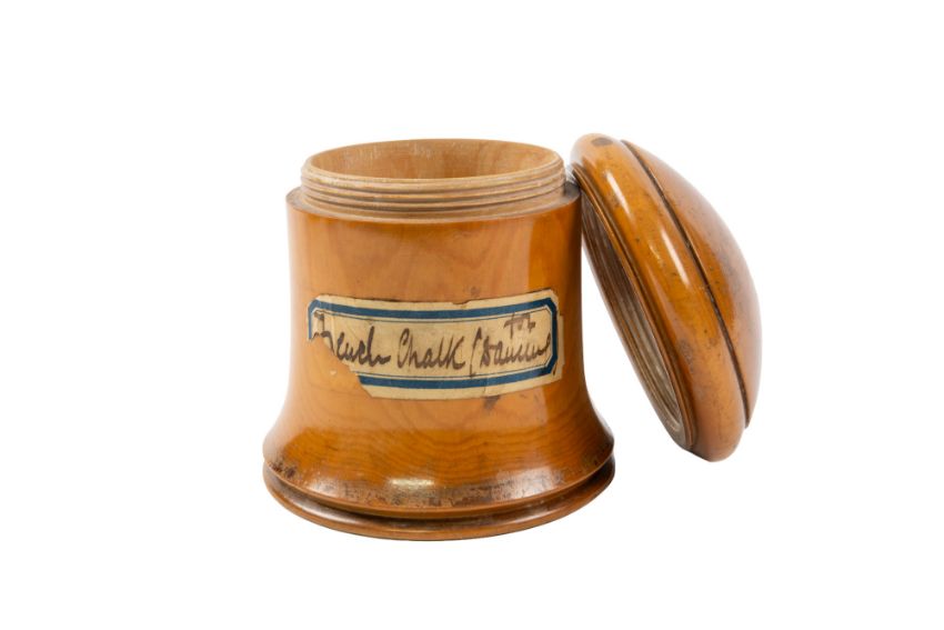 A lignum vitae string barrel, first half 19th century; the circular cover with cutter finial; above a spreading foot, 17cm high;  another lignum vitae string barrel, early 19th century, 11cm high; and a turned boxwood jar, 19th century, with domed screw-off cover, 9.5cm high