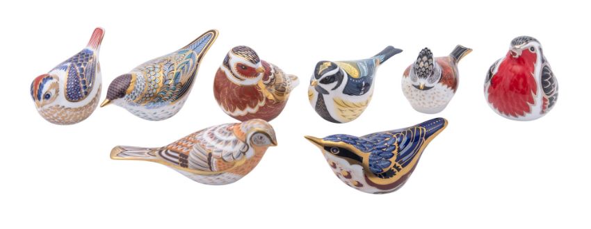 Eight Royal Crown Derby porcelain songbird paperweights including Midnight Robin, Nuthatch, Crested Tit, Nuthatch, Blackcap Warbler, Brambling, Garden Great Tit and Chaffinch, printed marks and gold buttons.