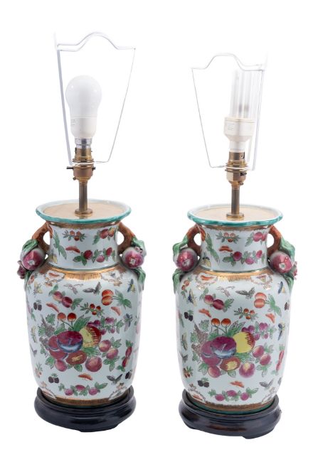 A pair of Chinese famille rose porcelain vases fitted as table lamps, 20th century; of baluster form, each with twin handles rising from fruit and flowers; decorated overall with insects, fruit and foliage; with turned wood bases; 43cm high including electrical fitments