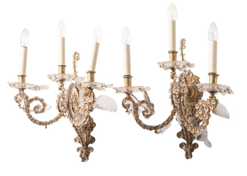 A pair of fine gilt metal and cut glass three-light wall appliques, late 19th century; the urn sockets in circular pans with faceted edges, on scrolling branches adorned throughout with faceted circular glass mounts and hung with shaped pendants; with conforming decoration to the openwork backplates; 48cm high excluding later electrical fitments, 40cm wide, 36cm protuberanceProvenance: From the Estate of the late Matthew Upham