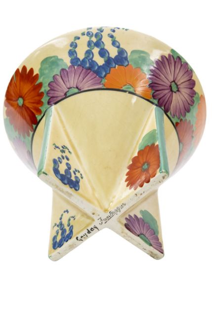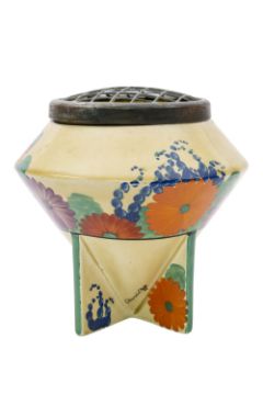A Clarice Cliff Fantasque conical shape rose bowl enamelled in the Gayday pattern, with metal cover, printed marks, 17cm high.