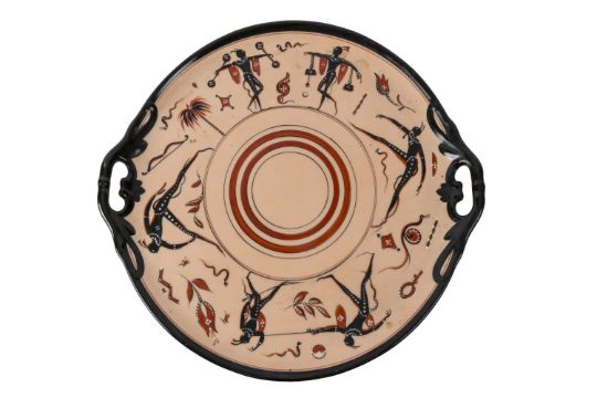 A porcelain cabaret tray of circular form decorated with negro warriors on a salmon ground, 37cm wide.