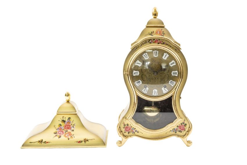 Elliot, a small lacquered chinosierie mantel clock having an eight-day duration movement, the arched-brass dial having a silvered chapter ring with black Roman numerals, a silvered boss to the arch engraved Tempus Fugit, and signed to the centre An Elliott Clock, the black lacquered case with Oriental decoration, brass bracket feet and surmounted by a brass handle, height 20cm inc. handle. Eluxa, a modern shaped lacquered mantel clock on wall stand, the movement striking the hours on a bell with the dial marked Eluxa, the gold painted case with floral decoration, height 43cm.