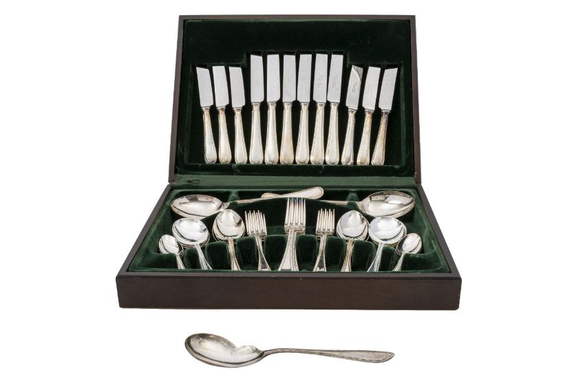 A cased part-canteen of silver plated flatware & cutlery, Old English bead pattern, with a non-matching serving spoon, contained in original case; the case 15.1" (38.4cm) long