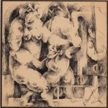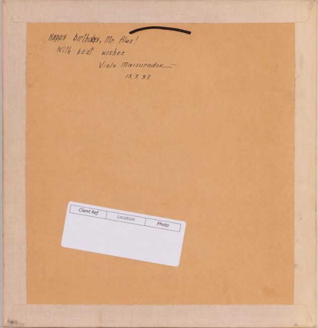 Viola Maisuradze (Georgian, 20th century) - 'Clown with orange' - Oil on canvas - 58.5 x 47.5cm 74 x 64cm framed - Signed and dated 1991 verso, titled verso - Viola Maisuradze (Georgian, 20th century) - A figural sketch study - Pen on paper - 18 x 18cm, 27 x 26cm framed - Signed lower right, inscription and dated 13.7.93 verso. (2)