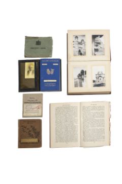A group of items relating to Fortunio Matania (Italian, 1881-1963) - To include a small collection of miniature family paintings including a woman on horse beside a foal, watercolour on paper, signed F Matania, a study of two horse heads, watercolour on paper, signed F Matania, further miniature watercolour's on paper, and miniature oils on canvas, two artists paint boxes, Prisoner of War (POW) letters received by Matania, further ephemera including family photographs, a bust, and other items to include watch with hand painted Leda and swan scene. Born in Naples, the son of artist Eduardo Matania, Fortunino Matania studied at his father's studio, designing a soap advertisement at the age of 9 and exhibiting his first work at Naples Academy at 11. At 20, he began working in Paris for 'Illustration Francaise' and, in 1902, was invited to London to cover the Coronation of Edward VII for 'The Graphic'. Matania subsequently covered every major event - marriage, christening, funeral and Coronation - of British royalty up to the coronation of Queen Elizabeth in 1953. In 1904, Matania joined the staff of 'The Sphere' where some of his most famous work was to appear, including his illustrations of the sinking of the RMS Titanic in 1912. Around 1906 to 1910 he painted the life in the lobby of the Hotel Excelsior in Rome. At the outbreak of the First World War, Matania became a war artist and was acclaimed for his graphic and realistic images of trench warfare. His painting for the Blue Cross entitled 'Goodbye, Old Man' showing a British soldier saying farewell to his dying horse, is a fine example of his emotive work. But it was after the war, when he switched to scenes of ancient high life for the British woman's magazine, 'Britannia and Eve' that Matania found his real career. He exhibited regularly at the Royal Academy, and also at the Royal Institute of Painters in Water Colours, where in 1917 he was elected a member.