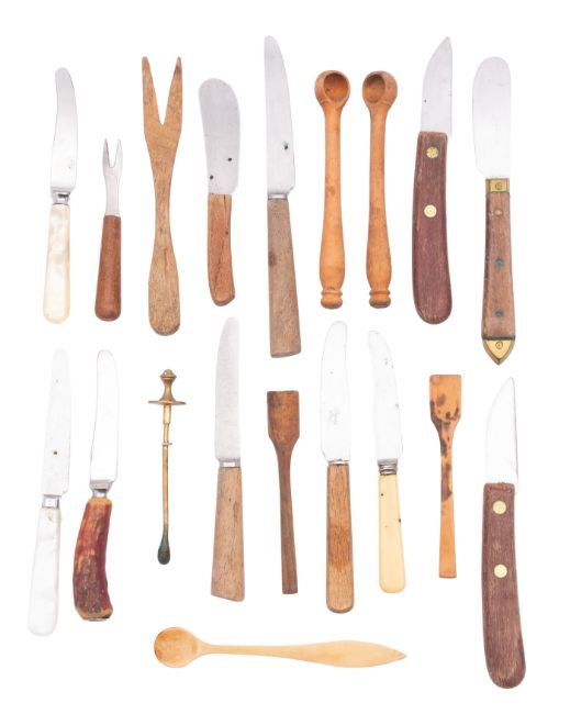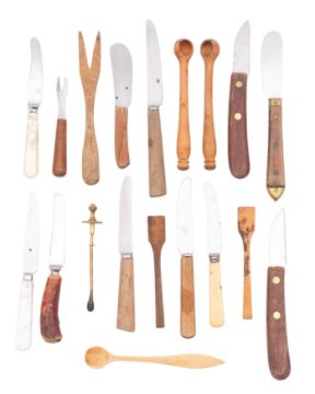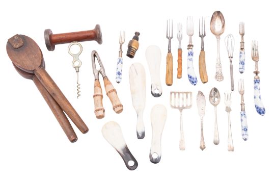 A 19th century burrwood bowl, hewn from a single piece of timber, with three later nailed sheet metal patches, 13cm high, 32.5cm diameter; a 19th century beechwood kitchen implement, formed as a pair of hinged pats, 27cm long; also, a turned horn bottle stopper; a nutcracker with bamboo handles; a metal and wood corkscrew; a group wooden handled butter knives; four horn shoe-horns; a group of wooden handled steel table knives; and a small quantity of silver plated flatware, some items with porcelain handles