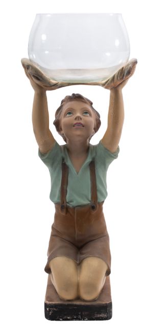 A Continental cast plaster shop or advertising figure of a kneeling lad listing a glass bowl aloft, early 20th century, 70cm high, [loss and repair.]