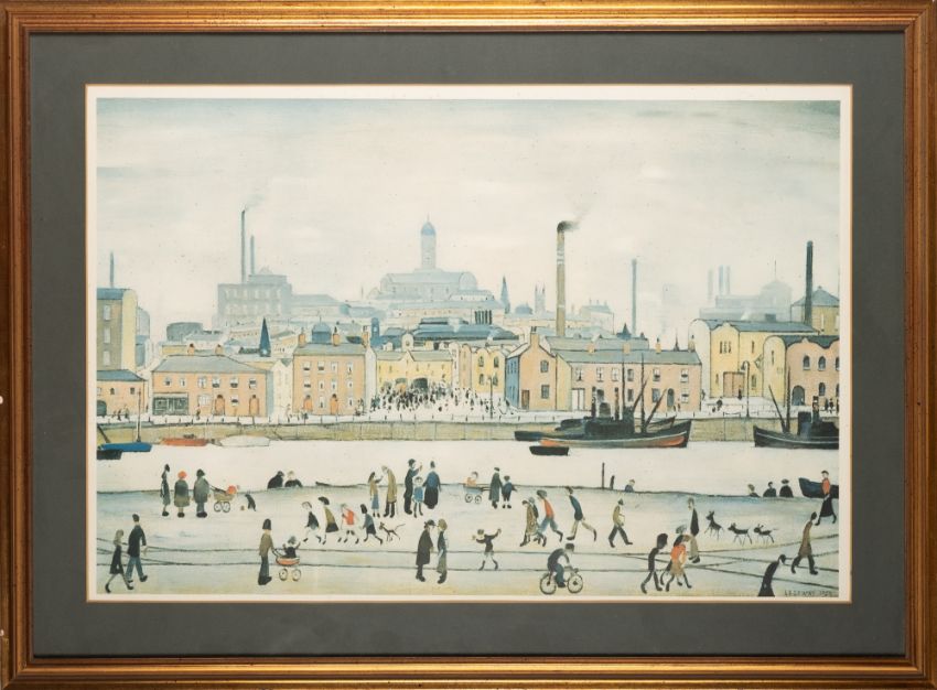 * After Laurence Stephen Lowry (British, 1887-1976) - Northern River Scene - Offset lithograph - 40.5 x 61cm, 56.5 x 76.5cm framed - After Laurence Stephen Lowry (British, 1887-1976) - A village square - Offset lithograph - 45.5 x 60.5cm, 61 x 76.5cm framed - After Laurence Stephen Lowry (British, 1887-1976) - A village square - Colour print - 36.5 x 50cm, 51.5 x 65cm - After Laurence Stephen Lowry (British, 1887-1976) - Coming from the mill - Offset lithograph - 28 x 49cm (4)